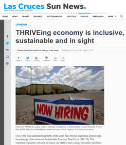 Together, this powerful national initiative coupled with state and local efforts will bring real opportunities and prosperity for all New Mexicans, regardless of where they live or work. We need not fear the transformation to a more diverse, inclusive and sustainable future. As long as legislation such as the THRIVE Act and the Sustainable Economy Taskforce guide our transformation we can all feel optimistic about what the future holds.